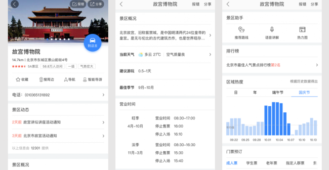百度地图此次联合国家文物局上线全国博物馆地图,将博物馆数字化,借助网络平台为全国人民展示各地历史的轨迹。以北京故宫博物院为例,通过百度地图全国博物馆地图,人们可以清晰了解它的地点信息及风景照片、博物馆概况、参观建议等,更有实时更新的景区动态信息让参观者提前了解到博物馆近期活动,帮助参观者选择最佳参观时间。