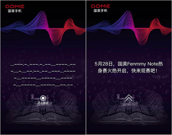 打开国美Fenmmy Note热身赛邀请函H5,是一组摩斯密码,点击下方解密按键,随着滴答滴答的声音摩斯密码逐渐被解密成汉字“5月28日,国美Fenmmy Note热身赛火热开启,快来观赛吧!”以声音来预告品鉴活动,更加证实了国美Fenmmy Note将在声音上做文章。