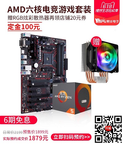 此外,如果你想打造AMD平台主机,则可以选择PRIME B350-PLUS主板搭配Ryzen 5 1600X的板U游戏套包,支付定金叠加店铺券后即可享受1879元的预购专属价,支持六期免息,并赠送一套RGB炫彩CPU散热器。