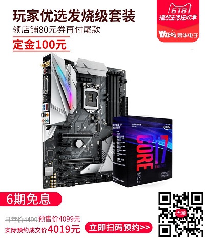 目前华硕ROG STRIX Z370-E GAMING主板搭配Core i7-8700K的板U发烧级套包支付定金,领取店铺80元券再付尾款即可享受4019元的预购专属价,并赠送显卡支架,享受六期免息。