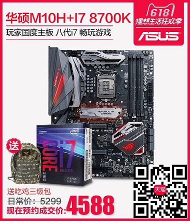 特别向大家力推华硕ROG M10H主板搭配Core i7-8700K的板U套包。目前支付定金100元预购该套包,即可享受4588元的预购专属价,并享受三期免息。此外,前20名支付定金和尾款的消费者还可获赠吃鸡信仰三级包,喜欢吃鸡的你千万可别错过了!