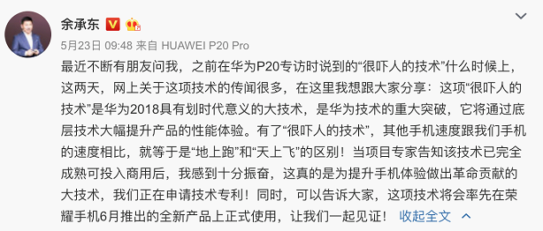 相信不少人跟笔者一样,在看完小米8发布会,对周三华为即将发布的“很吓人的技术”表示十分期待。还记得4月华为P20的发布后的媒体采访环节,余承东爆出了一个彩蛋,说华为在今年将会有一次重大的技术突破。当时激动的余承东用“很吓人”来形容这项突破,在前不久又透露这项新技术的商业价值将会达到100亿美元,抛开技术本身,这个价值就已经蛮“吓人”的了。5月23日,余承东更在微博表示,这项“很吓人”的技术是华为2018年具有划时代意义的大技术,是华为技术的重大突破。有了这项新技术,华为手机和其他手机的运行速度将拥有“天上飞”和“地上跑”的巨大差别,同时,微博还透露了新技术已在申请专利并将会率先在荣耀手机6月推出的全新产品上正式使用。