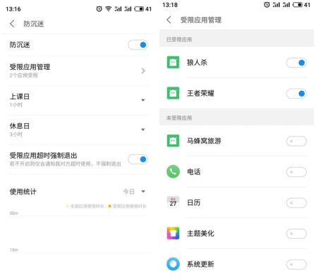 值得一提的是,Flyme 7防沉迷也提供了类似苹果App Limits的功能。对于当天和最近7天的受限应用使用情况Flyme系统会进行集中统计,方便家长据此及时进行管理方案调整。