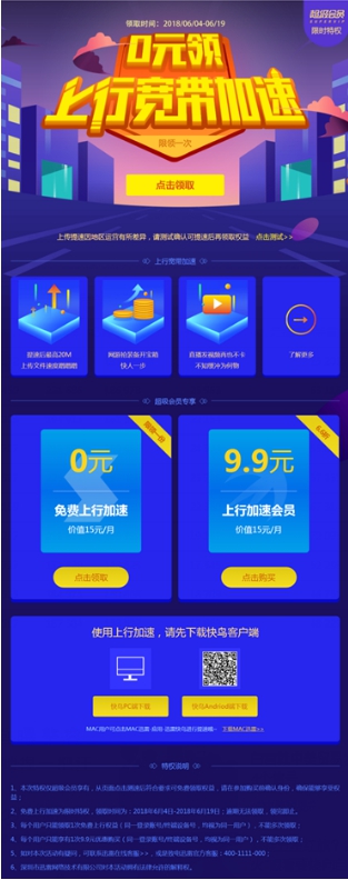 4、特别提醒:每个用户只能领取1次免费上行权益,每个用户只能享有1次9.9元优惠购买,请不要重复领取。
