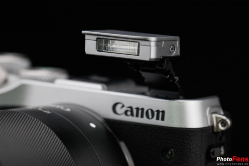M6的内闪藏在机顶左上方,由一个机械联动开关开启(即不开机的情况下也可弹出),而M6的内闪因为是多关节设计,所以与M3时期一样可以手动调整灯头的方向,最常见使用的手法就是在室内打跳闪来柔化光线。
