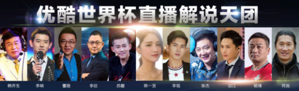 因为直播授权,优酷首先将获得全套央视解说阵容。贺炜、洪钢、朱晓雨、刘嘉远、曾侃以及嘉宾杨晨、徐阳,五大名嘴联手两大前国脚,带给球迷最专业、最激情的赛事体验。另外,一支包括韩乔生、董路、孟洪涛、苗霖、颜晓华等专业解说大神将加盟优酷的解说天团,以专业的角度结合更加互联网的表达给优酷用户带来不一样的解说体验。