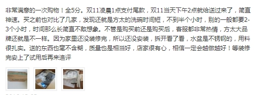 “我妈是那种特爱干净,又不喜欢浪费的人,你让她把碗攒起来洗,或者几个碗放那种像洗衣机一样的洗碗机里轰隆个把小时,我估计她得把我数落的一无是处,方太水槽洗碗机正好解决了这些痛点,而且洗碗很干净,洗完还可以自动烘干,比我手洗干净多了”、“洗的很干净,快洗只要18分钟,与水槽一体,不占空间”、“发现方太水槽洗碗时间很短,不到半小时,不像别的洗碗机一般都要2-3小时,简直不敢想象”。
