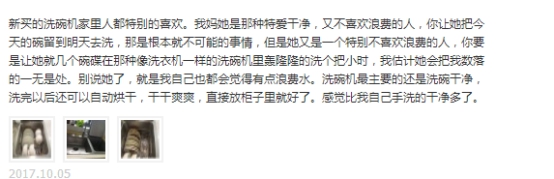 “中式小厨房的福音,带娃家庭的标配,拥有一台洗碗机是造福一生的事情,比老公都靠谱”、“从小就期待中式洗碗机可以早点发明出来,现在终于梦想成真了,以后不用像父母一样逼着自己的孩子去洗碗了”、“爸妈眼睛不好,希望他们可以吃到更加干净的碗碟和蔬菜”、“同时讨好媳妇和母上大人的利器,妈妈和未来的媳妇都不用洗碗洗菜了”。