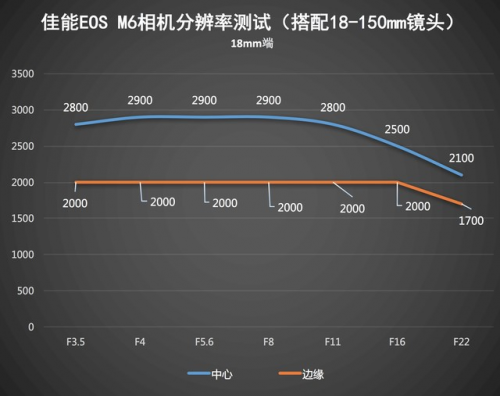 通过客观测试可以看到,佳能微单M6配合自家18-150mm镜头,中心分辨率读数最高能达到2900,同时无论18mm端还是150mm端,这支佳能EF-M 18-150mm f/3.5-6.3 IS STM镜头都在F8光圈下达到了最佳画质,可以给各位用户做一个参考。