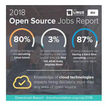 近日,Linux基金会发布了2018年度开源工作报告(Open Source Jobs Report)。该报告是Linux基金会与Dice.com合作,通过对环球多家企业、政府机构、人事顾问公司、中小企业的750名人力资源经理及超过6500名环球开源技术专家进行访问,而做的一项关于开源界职场情况的调查。