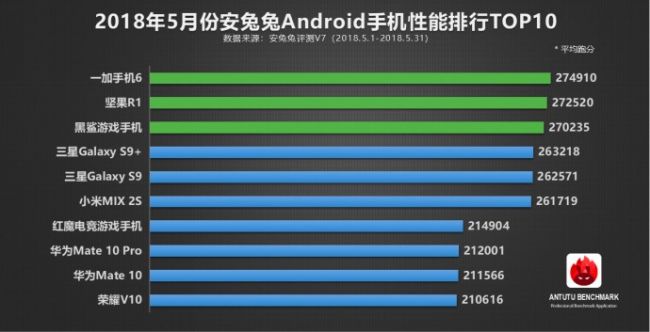 图:5月份安兔兔Android手机性能排行TOP10,一加6获TOP1