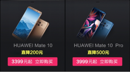 比HUAWEIMate10更高端的HUAWEIMate10Pro系列,还有最高直降500元优惠,6GB+64GB版和6GB+128GB版都直降500元,售价分别为3999元和4499元。在华为商城(vmall.com),还可尊享6期免息优惠。