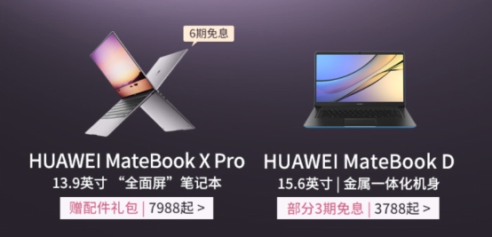 HUAWEIMateBookXPro系列自带接近全面屏的大屏幕和高达91%的占屏比,最近在华为商城(vmall.com)购买HUAWEIMateBookXPro系列笔记本,还有含内胆包和扩展坞的配件礼包赠送,并可尊享分期免息优惠。