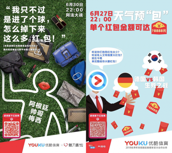 随着赛程的推进,除了“进球红包雨”的基础互动外,优酷也在根据赛况不断革新红包雨玩法。如在27日晚的德韩大战上,优酷将进球红包雨的单个红包最高金额,上调至38888元,给了不少球迷一个大惊喜。而前日备受关注的法阿之战中,优酷还特别推出进球红包雨女生福利专场,将由魅力惠提供的Gucci包、淘宝300元的口红红包等女性用户偏爱的礼品加入红包雨中。