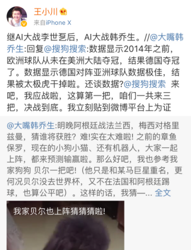 就在点燃2018年夏季夜晚的俄罗斯世界杯,两支球队是A胜过B还是B胜过A,所有球迷都对这项竞猜乐此不疲,这也成为了AI进化的新课题。6月29日,阿根廷对战法兰西之前,足球名嘴韩乔生和自家宠物狗贝尔联合预测法国队胜,预测界的新锐同行“搜狗汪仔”随即应战,定下三局两胜之约。搜狗CEO王小川转发回应“继AI大战李世石后,AI大战韩乔生。”路人看来这句话是一语双关,潜台词是:AI在围棋上赢了李世石,自家的AI汪仔也会赢过人类解说员韩乔生,且看结果如何。