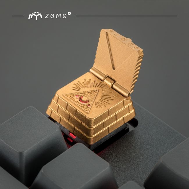 不同于一般的整体结构键帽,这款法老-上帝之眼键帽的顶盖是可以开启的。键帽顶盖与底座之间仅使用一根0.9mm的铜针连接,以铜针为轴旋转可以开合顶盖,手指轻轻一按就能打开顶部的金盖。这种可动结构开创了全新的键帽模式,相对于传统的一体结构键帽,多了把玩的乐趣。