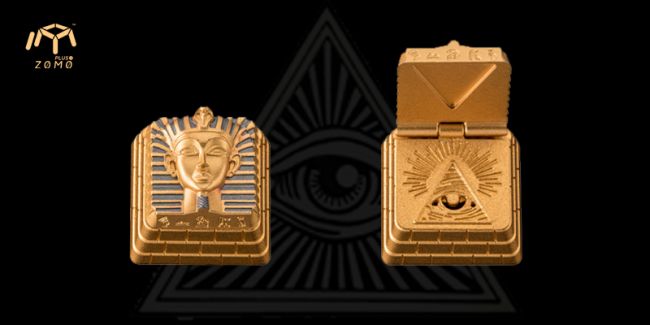 仅从颜色和砖块就知道这款键帽产品的灵感是来自古埃及文明。整个键帽呈金字塔梯形状,设计师巧妙利用了金字塔石块的方块来构筑键帽的四个侧面图案,正前方甚至刻上了古埃及的象形文字(你能破解其意吗?);键帽顶面是最知名,最具代表性的埃及法老图坦卡蒙的黄金面具图案。轻轻打开上盖后,展现在我们面前的便是历来就充满神秘气息 ,在键帽第二层最具著名的上帝之眼(又称荷鲁斯之眼)图案,透出幽幽红光,仿佛目光如炬般在注视世间万物。外加金色为主色调的配色,键帽由内到外都散发着古埃及神秘又悠长的气息。触摸这颗键帽,仿佛是在触摸有着4000多年里历史的古文明。