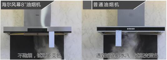 视频中,实验人员先在海尔风幕8°油烟机和普通油烟机上分别贴上一张遇水变蓝的试纸,先打开烟机下方的发烟锅,然后开启2台油烟机。海尔风幕8°油烟机前部“呼”出风,将发烟锅发出的水汽主动捕捉聚拢,并在水汽与试纸之间形成一道风幕墙,有效防止了水汽四散逃逸,试纸不变色。而普通烟机没有风幕保护,水汽四散逃逸污染试纸,试纸快速遇水变蓝。