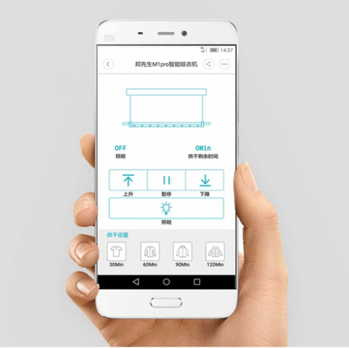 邦先生已与小米智能家庭平台进行了深度合作,只需下载"米家APP",通过手机直接操控即可实现一键智能晾晒。