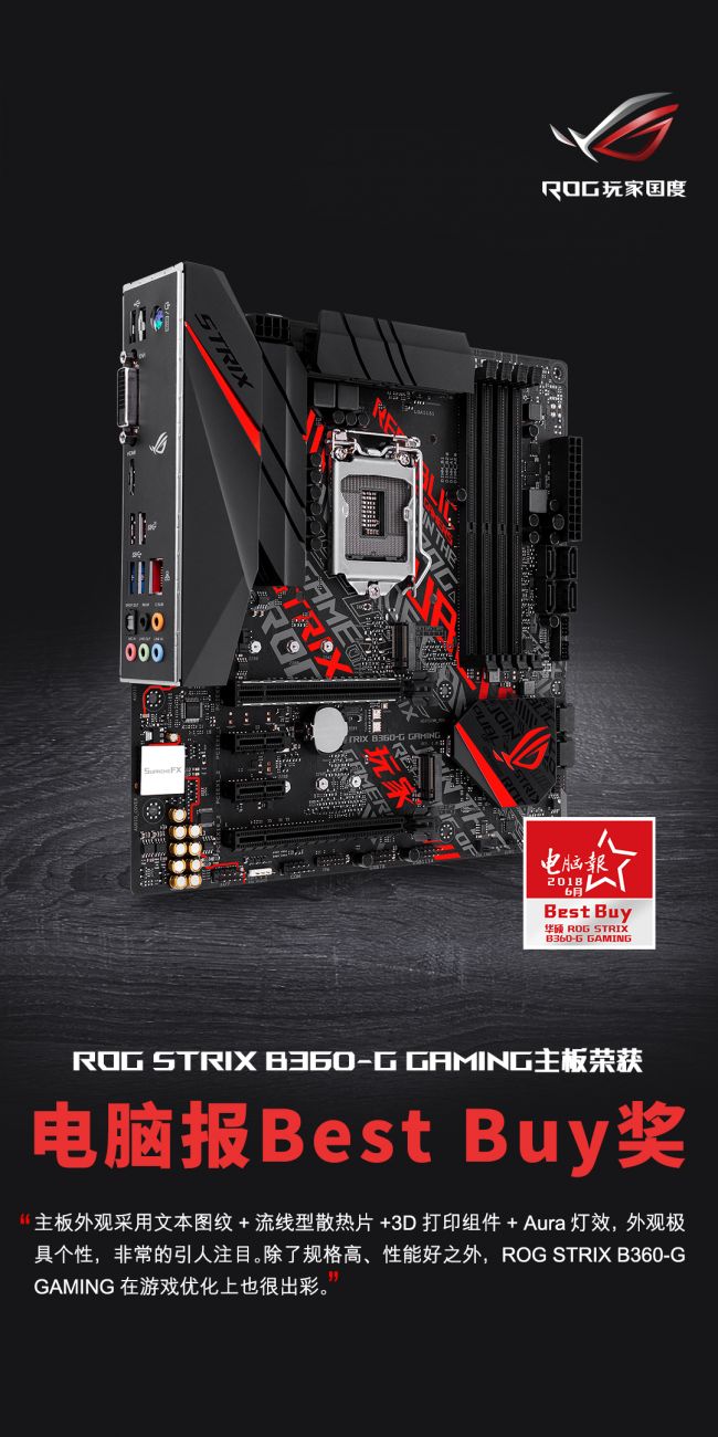 性能强劲,外观出彩,再加上非常美丽的价格,如此给力的华硕ROG STRIX B360-G GAMING电竞主板,荣获电脑报Best Buy奖 可谓实至名归,非常值得向广大主流玩家们力推!
