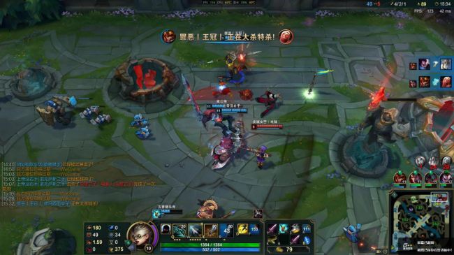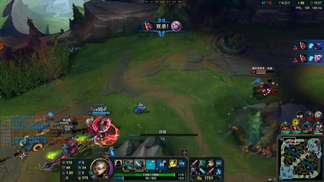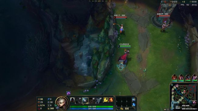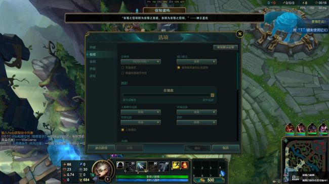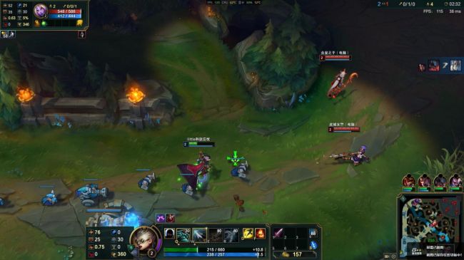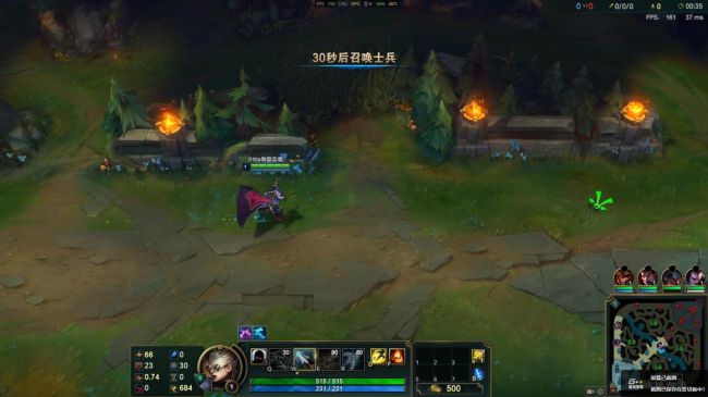 进入召唤师峡谷对战游戏模式,待在泉水,特效,阴影,环境和人物细节设置为极高,特效全开,实时帧数在150左右进行波动。
