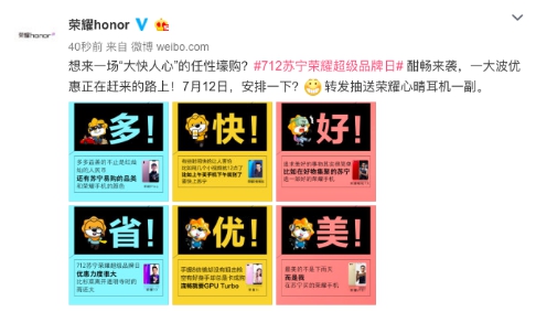 7月5日,荣耀官微发布了712苏宁荣耀超品日的主题海报。“多!”、“快!”、“好!”、“省”、“优!”、“美!”六字加感叹号,从多个角度诠释着超品日 “大快人心”的主题,那么这次苏宁和荣耀能给消费者带来怎样“大快人心”的体验和享受呢?