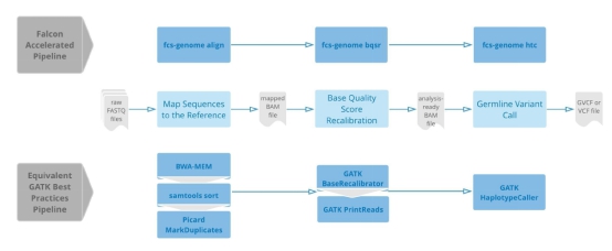 与GATK 最佳使用流程相对称,典型的基因测序数据分析流程始于原始FASTQ序列两端读长(paired-end reads),进一步获取一组经过滤的变体,对其进行标记以供进一步分析。图3描述了华为云基因加速服务种系变异调用流水线的具体流程,中间面板指示开始的通常工作流程,上下分别显示华为云FPGA基因加速方案中的峰科加速流程和GATK最佳使用流程命令实现方式的工作流程。