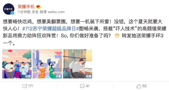 继昨日荣耀官微正式公布712苏宁荣耀超品日的活动主题「大快人心」后,今日荣耀官微再次发布了一组预热海报,为即将来临的超品日宣传造势。此次海报由三组动图组成,从“畅快吃鸡”、“美翻票圈”和和“一机装下所爱“三个场景,诠释此次苏宁荣耀超品日将让你生活”大快人心“。