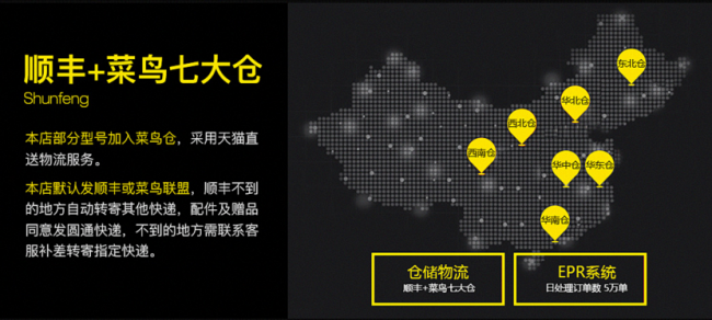 为了提供至上的消费者购物体验,火影斥巨资打造一套智能的ERP系统,日处理订单达到5万单;同时店内大部分型号均加入菜鸟仓,依托阿里强大的物流体系,华南、华中、华东、西南、西北、华北、东北等7大仓库联动,采用天猫直送物流高速服务;火影与顺丰快递达成深度合作,默认发顺丰快递,偏远地区则自动转寄其他高速快递物流。