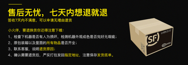 售后无忧,七天内想退就退。消费者于火影旗舰店购买的机器,均能于签收7天内,无理由申请退货。
