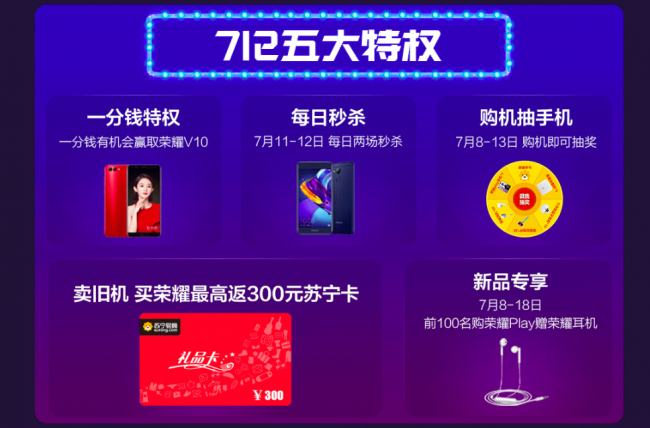 除了最高直降500元外,712苏宁荣耀超品日还积极为消费者提供五大超值特权:一分钱有机会赢荣耀V10;7月11-12日每日两场秒杀;7月8-13日购机抽手机福利;卖旧机买荣耀手机最高返300元苏宁卡;7月8-18日前100名购买荣耀Play赠荣耀耳机等,可以说是惊喜不断。