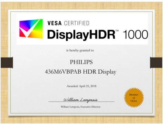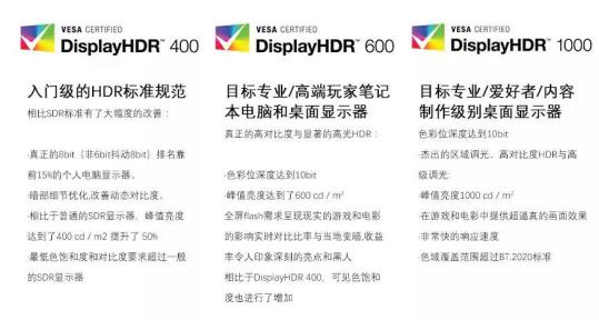 尽管HDR技术在显示器领域不断得以应用,目前市场上也充斥着各种各样的 HDR 标志和品牌,但却没有一个透明公开的评判标准,为了打破这一现状,视频电子标准协会VESA(Video Electronics Standards Association)推出了显示器行业首个HDR 标准,通过测试规范对高动态范围(HDR)的质量进行界定,标准涵盖的要素包括亮度、色域、位深与上升时间,让消费者能够更加清晰透明的了解显示设备的HDR性能细节。Display HDR标准为 PC 显示器确立了三种 HDR 性能等级:基本(DisplayHDR 400),中级(DisplayHDR 600)和高级(DisplayHDR 1000)。只有达到HDR1000标准的显示器,才能称得上是专业级别的HDR显示器,并且显示性能远超越一般级别的电视机。