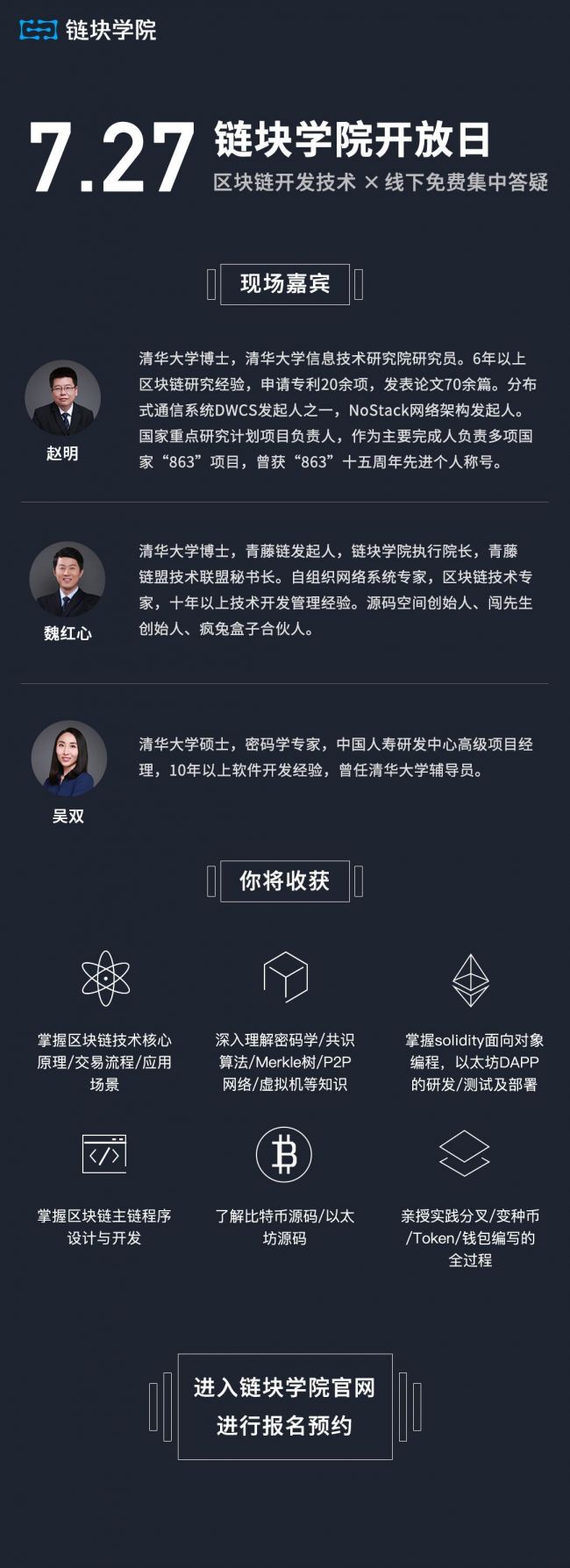 以上详细介绍了作为一名区块链工程师应该具备的知识结构。各位可以结合自己的技术背景和兴趣选择一个方向进一步研究,如果有更多区块链学习方面的问题,可报名参与链块学院的开放日活动: