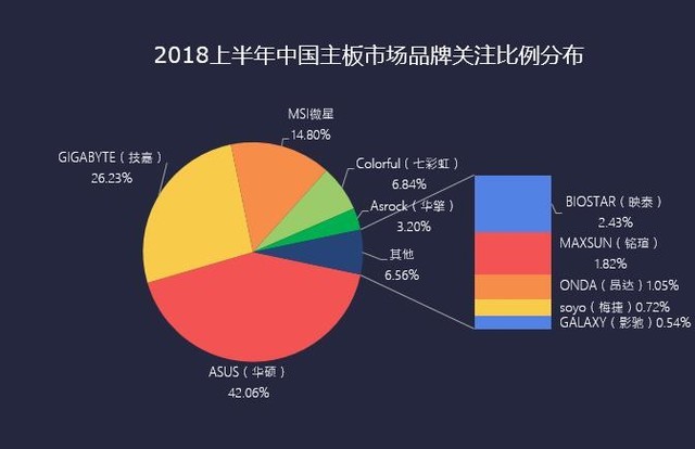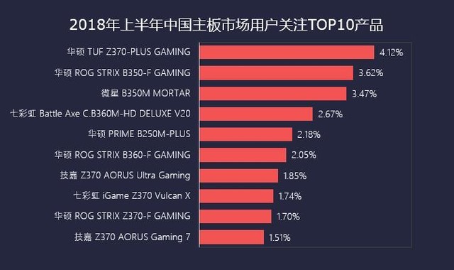 根据ZDC互联网调研中心2018年上半年的数据显示,华硕主板以高达42.06%的关注比稳居中国主板市场品牌关注度第一,比第二名(26.23%)和第三名(14.8%)的关注比例总和还要多,人气遥遥领先,可谓是当之无愧的第一主板品牌!此外,在2018年上半年中国主板市场用户关注TOP10主板产品当中,华硕主板的表现同样抢眼,不仅TUF Z370-PLUS GAMING和ROG STRIX B350-F GAMING主板荣登第一和第二,更在TOP10榜单中占据了五个席位,足见华硕主板备受用户的关注!