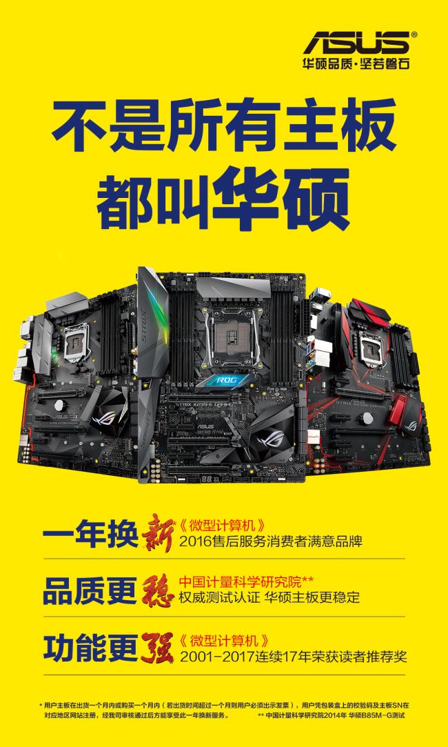 为了更好地回馈消费者,华硕主板在为用户提供优质产品的同时,不断完善服务体系,保障华硕用户的使用权益。为此,华硕主板在四年质保(需注册)的基础上,推出全新的“华硕主板尊享1年换新”活动。活动期间里,凡是购买华硕主板的用户,扫描下方二维码,关注华硕ROG玩家国度微信公众号注册成功后,即可获得一年换新服务!来ROG玩家国度专区https://www.chiphell.com/forum-21-1.html,你的信仰就等你来助力!