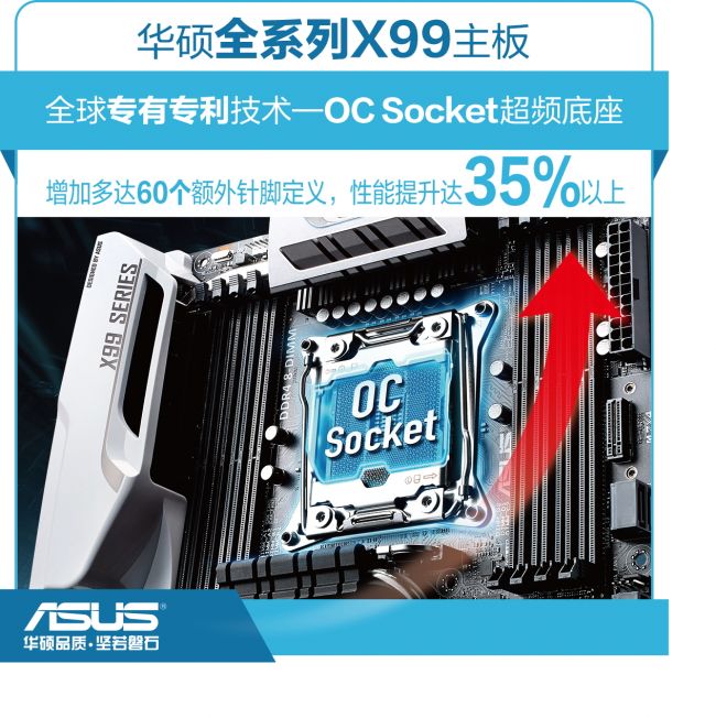 在X99平台时代,华硕在主板上独家推出了“OC Socket至尊超频神座”技术,大胆的直接对主板CPU插座本身做了改动,增加多达60个额外针脚,可有效提升处理器30%以上性能。该技术为超频发烧友提供了绝佳超频环境,打破了诸多超频纪录,成为超频界的一代佳话。
