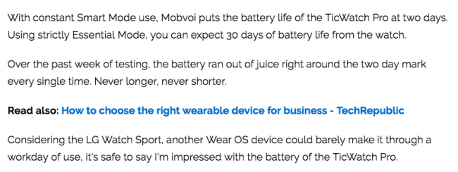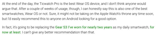 “总而言之,我认为不会有人否认TicWatch Pro是最好的Wear OS设备。而且,经过几周的使用后,老实说,我觉得不论是在Wear OS阵营,还是其他阵营,它都是最好的智能手表之一。当然,它可能不会在短期内攻占下Apple Watch的宝座,但我会很乐意向Android手机用户推荐这款智能手表,它是一个很好的选择。