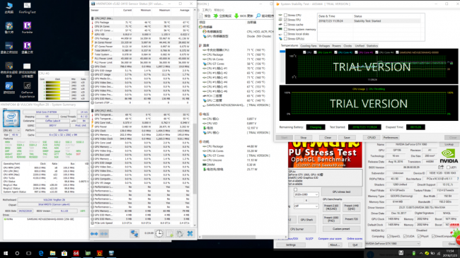 用AIDA64软件对影刃Z5进行单烤FPU实测,室温20°,烤机时间15分钟(一般10分钟左右就好了),可以看到单烤FPU时,CPU的温度保持在71℃,功耗45W,频率2.5Ghz,表现正常。