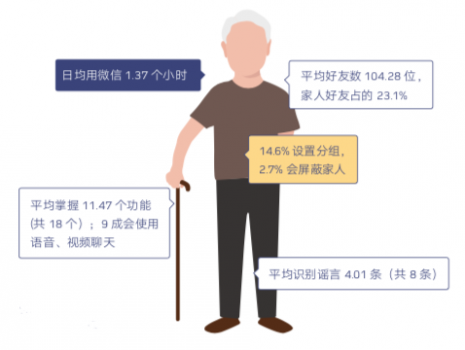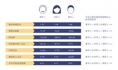 调研发现,老年人在微信使用程度上较中青年更浅,无论是每天使用时间(依次为1.37小时、1.78小时与1.86小时)、掌握功能数(依次为11.47个、15.03个与16.83个)还是好友数(依次为104.28个、188.12个与305.28个)。在识别谣言的能力上,中年人与老年人水平相当,都显著低于青年人。