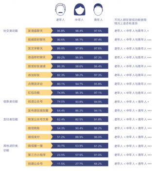 这种现象,最直观的投射集中在微信。研究显示,目前子孙对长辈的反哺还停留在较浅层面,排名靠前的微信反哺功能依次为:发红包、发语音、视频聊天、语音聊天等工具性技能。相反,诸如发布、点赞评论朋友圈、选择公众号等偏重于内容性的反哺较少。