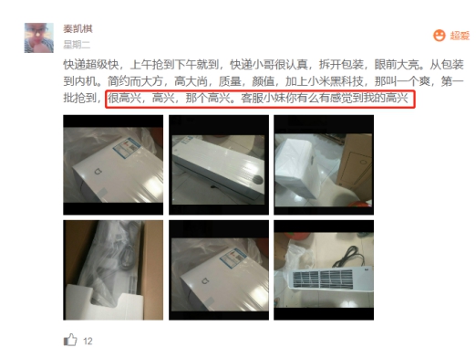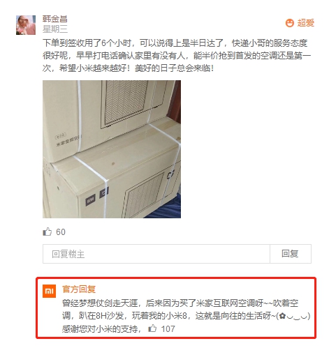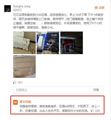 看到这里,小编突然有了一个大胆的推测:有这么皮的客户小姐姐,肯定是前来购买米家互联网空调的米粉给宠出来的。果不其然,小编在用户评论里还看到了一波疑似在撩客服小姐姐的用户评价。喂,你们是来买空调的,不是来找对象的啊!!