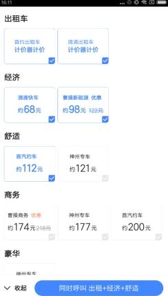 除了出租车是计价器计价,高德打车提供了每个打车平台每种车型的预计价格,用户可根据情况自主勾选多个运力,在打车难的情形下拥有更多选择,从而提高接单速度。