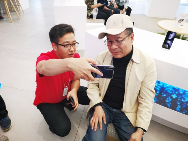 照片当中的这位李先生正在体验顾问的指导下,聚精会神地学习着华为手机的拍照专业模式。