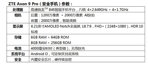 在硬件上,中兴天机Axon9 Pro(行业版)采用经过国家密码管理局权威认证的独立安全芯片,运用全面的国密硬算法和软算法,真正实现底层硬件加密。在系统上,中兴天机Axon9 Pro(行业版)采用了安全隔离双系统,可将办公系统与日常生活系统完全隔离。