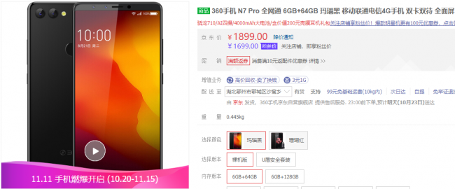 其他方面,360手机N7 Pro采用了双面玻璃机身设计,无刘海5.99英寸全面屏,分辨率2160×1080像素,有珊瑚红和玛瑙黑两色可选。