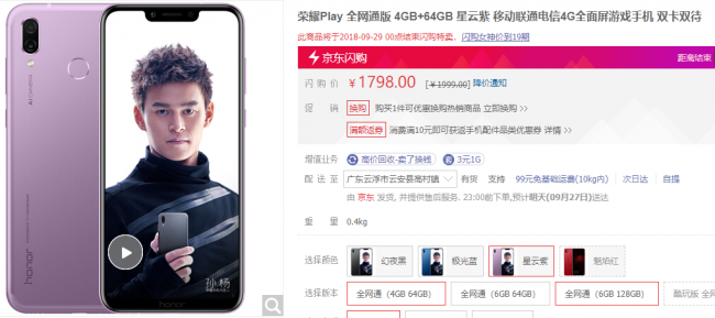 配置方面,荣耀Play搭载了麒麟970处理器,有4GB和6GB两种运存规格可选,其中4+64GB近期售价1798元,6+64GB版为2098元,6+128GB版为2399元。续航方面,配备了一枚3750mAh容量电池,支持18W快充。