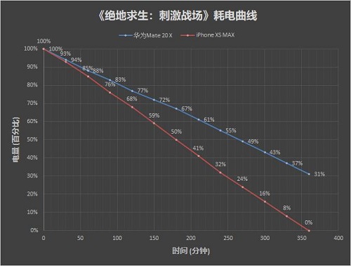 实际测试结果也是如此,在用《刺激战场》来测试华为Mate 20 X与iPhone XS Max这两款机型的游戏续航的时候,两款手机都开启最高画质最高帧数,亮度都调整为50%,音量0%,结果最终在6个小时的时候iPhone XS Max已经电池耗尽,而华为Mate20 X还有31%的电量。