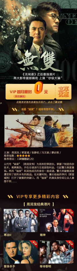 想要一睹“发哥满血归来”的巅峰状态?想要重新回顾港片黄金时代的喋血江湖?12月20日,《无双》重磅上线华为视频,同期还有“新用户首月0元”会员权益活动邀你同享。即日起至2019年2月28日,凡华为视频VIP会员新用户,首次开通连续包月服务,即可享受“首月0元” VIP会员福利,品质大片随时看!