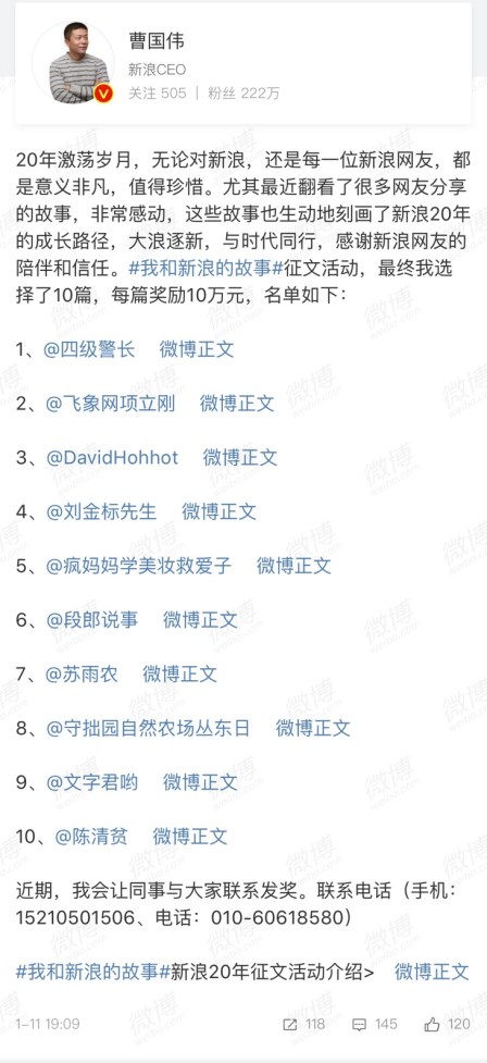 1月11日,“美好新年 奇幻上演”2018微博之夜盛典隆重举行,来自各行各业的“大咖”和新浪董事长兼CEO、微博董事长曹国伟共同开启新浪的新时代。盛典当晚,曹国伟同时在微博揭晓了#我和新浪的故事#有奖征文结果,十位网友获奖,将分享百万奖金。