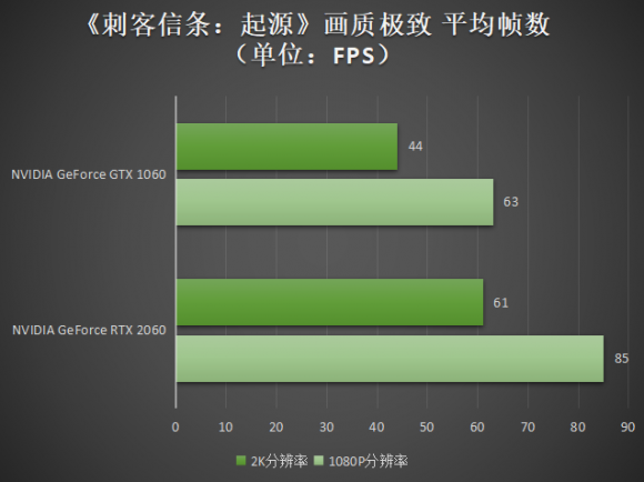 《刺客信条:起源》在1080P分辨率极致画质下,GeForce GTX 1060的平均帧数为63FPS,GeForce RTX 2060的平均帧数则达到85FPS。而在2K分辨率极致画质下,GeForce GTX 1060的平均帧数仅有44FPS,而GeForce RTX 2060测试结果有了63FPS的平均帧数,足够玩家们在古老的埃及文明中体验到秘境探宝的兴奋和快感。